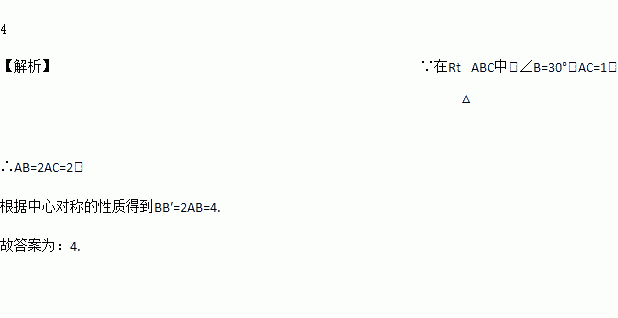 如图是一个中心对称图形,A为对称中心,若∠C=90°, ∠B=30°,AC=1,则BB′的长为________.