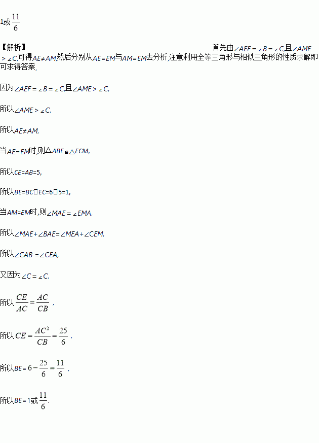 如图,△ABC≌△DEF(点A、B分别与点D、E对应),AB=AC=5,BC=6,△ABC固定不动,△DEF运动,并满足点E在BC边从B向C移动(点E不与B、C重合),DE始终经过点A,EF与AC边交于点M,当△AEM是等腰三角形时,BE=__________.