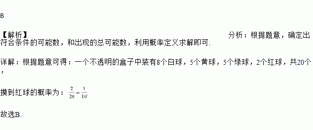 一个不透明的袋中共有20个球,它们除颜色不同外,其余均相同,其中:8个白球,5个黄球,5个绿球,2个红球,则任意摸出一个球是红球的概率是( )