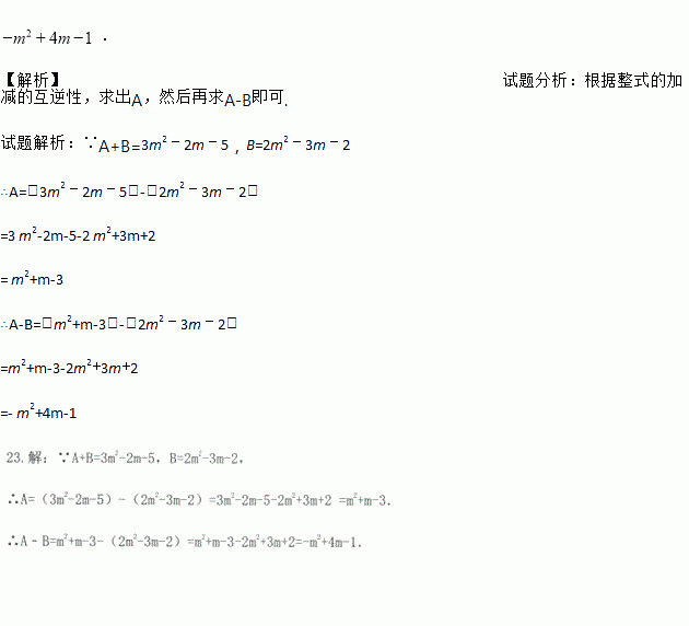 已知多项式A,B,计算A﹣B.某同学做此题时误将A﹣B看成了A+B,求得其结果为A+B=3m2﹣2m﹣5,若B=2m2﹣3m﹣2,请你帮助他求得正确答案.