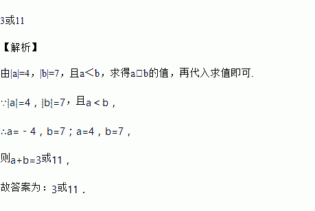 如果|a|=4,|b|=7,且a<b,则a+b=______.