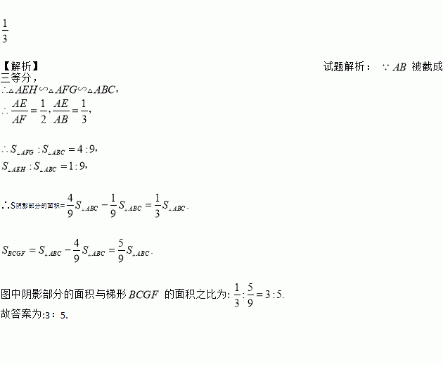 如图,△ABC是等边三角形,被一平行于BC的矩形所截,AB被截成三等分,则图中阴影部分的面积是△ABC的面积的______