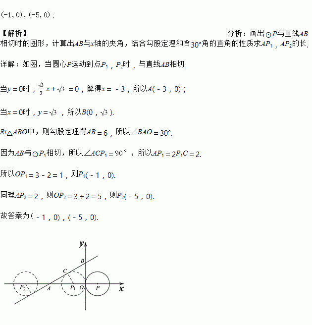 如图,直线y=x+与x轴、y轴分别相交于A,B两点,圆心P的坐标为(1,0),⊙P与y轴相切于点O.若将⊙P沿x轴向左平移,当⊙P与该直线相切时,点P坐标为___.