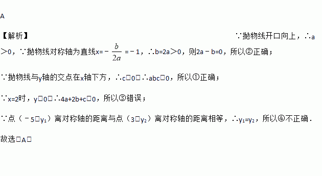 如图是二次函数y=ax2+bx+c图象的一部分,其对称轴是x=﹣1,且过点(﹣3,0),下列说法:①abc<0;②2a﹣b=0;③4a+2b+c<0;④若(﹣5,y1),(3,y2)是抛物线上两点,则y1<y2,其中说法正确的是( )