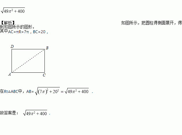 如图,有一圆柱体,它的高为20cm,底面半径为7cm。在圆柱的下底面A处有一个蜘蛛,它想吃到上底面上与A点相对的B点处的苍蝇,需要爬行的最短路径是__________cm。(结果用带根号和π的式子表示)