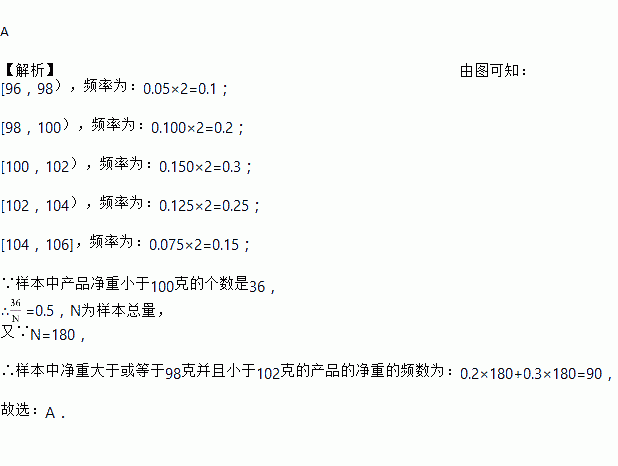 某工厂对一批产品进行了抽样检测.右图是根据抽样检测后的产品净重(单位:克)数据绘制的频率分布直方图,其中产品净重的范围是[96,106](即96≤净重≤106),样本数据分组为[96,98)(即96≤净重<98)以下类似,[98,100),[100,102),[102,104),[104,106],已知样本中产品净重小于100克的个数是36,则样本中净重大于或等于98克并且小于104克的产品的个数是 ( )