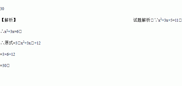 30 【解析】试题解析:∵x2+3x+5=11, ∴x2+3x=6, ∴原式=3(x2+3x)+12 =3×6+12 =30.