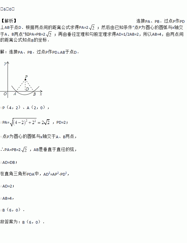 如图,在直角坐标系中,以点P为圆心的圆弧与x轴交于A、B两点,已知P(4,2)和A(2,0),则点B的坐标是_____.