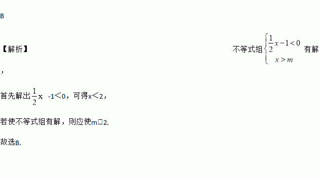 B 【解析】不等式组有解, 首先解出 -1<0,可得x<2, 若使不等式组有解,则应使m<2. 故选B.