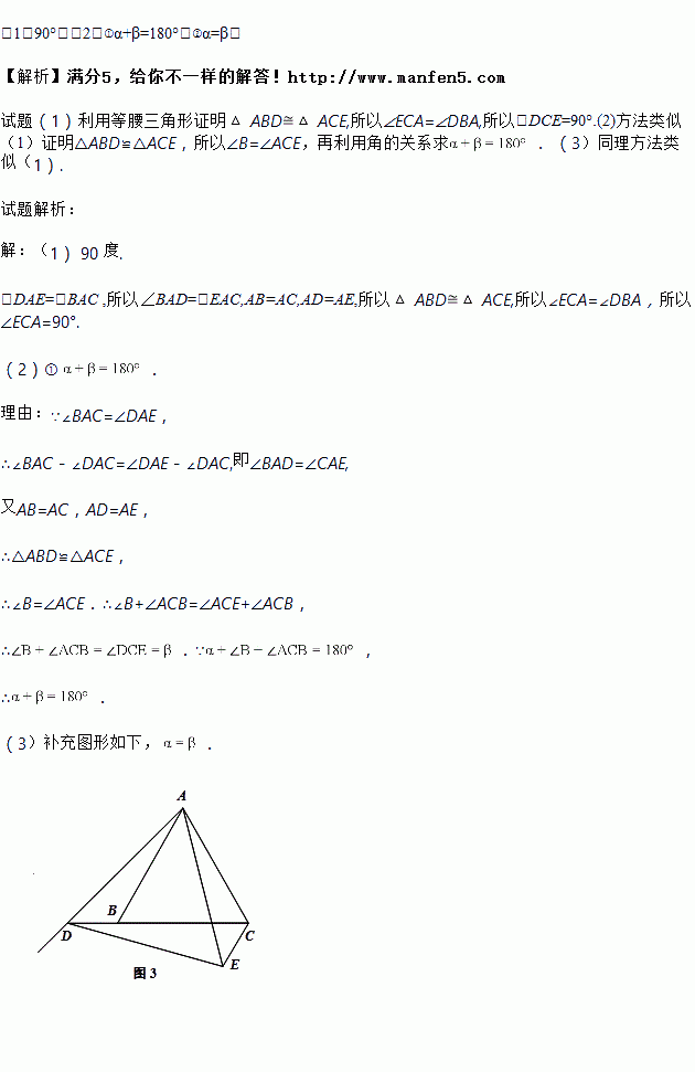 ①如图2,当点D在线段CB上,∠BAC≠90°时,请你探究α与β之间的数量关系,并证明你的结论;
