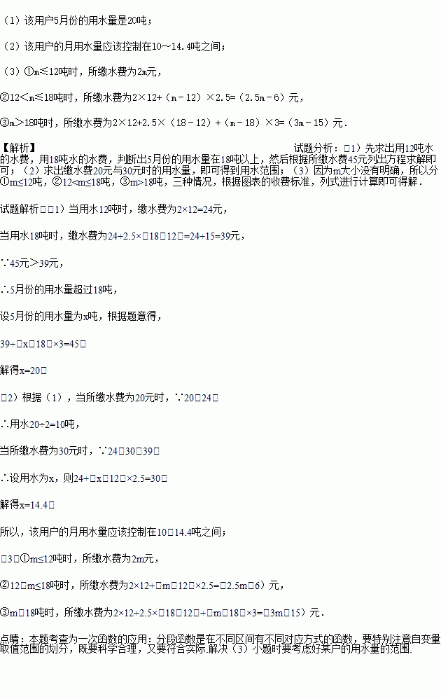 (3)若某用户的月用水量为m吨,请用含m的代数式表示该用户月所缴水费.