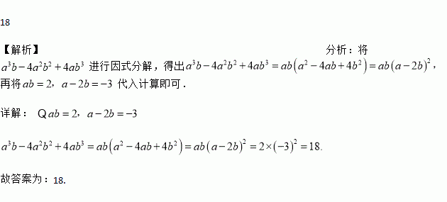 已知ab=2,a﹣2b=﹣3,则a3b﹣4a2b2+4ab3的值为_____.