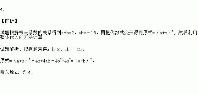 已知方程x2﹣2x﹣15=0的两个根分别是a和b,求代数式(a﹣b)2+4b(a﹣b)+4b2的值.