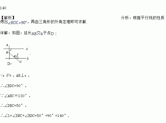 如图,∥,AB⊥,BC与相交,若∠ABC=130°,则∠1=________°.
