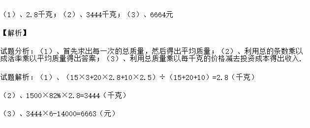 (3)如果把这种鱼全部卖掉,价格为每千克6元,若投资成本为14000元,这种鱼的纯收入是多少元?
