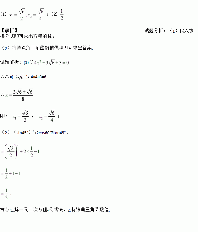 (1) ;(2) 【解析】试题分析:(1)代入求根公式即可求出方程的解; (2)将特殊角三角函数值供稿即可求出答案. 试题解析:(1)∵ ∴△=(-)2-4×4×3=6 ∴ 即: , ; (2)(sin45°)2+2cos60°﹣tan45°. . 考点:1.解一元二次方程-公式法.2.特殊角三角函数值.
