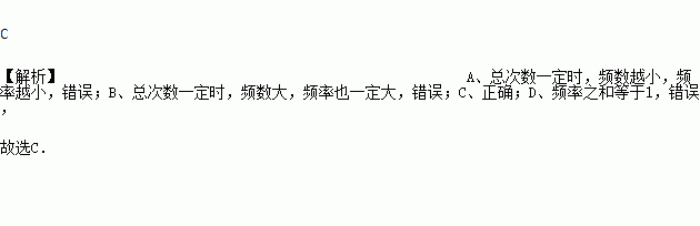 C. 频数一定时,频率越小,总次数越大 D. 频数很大时,频率可能超过1