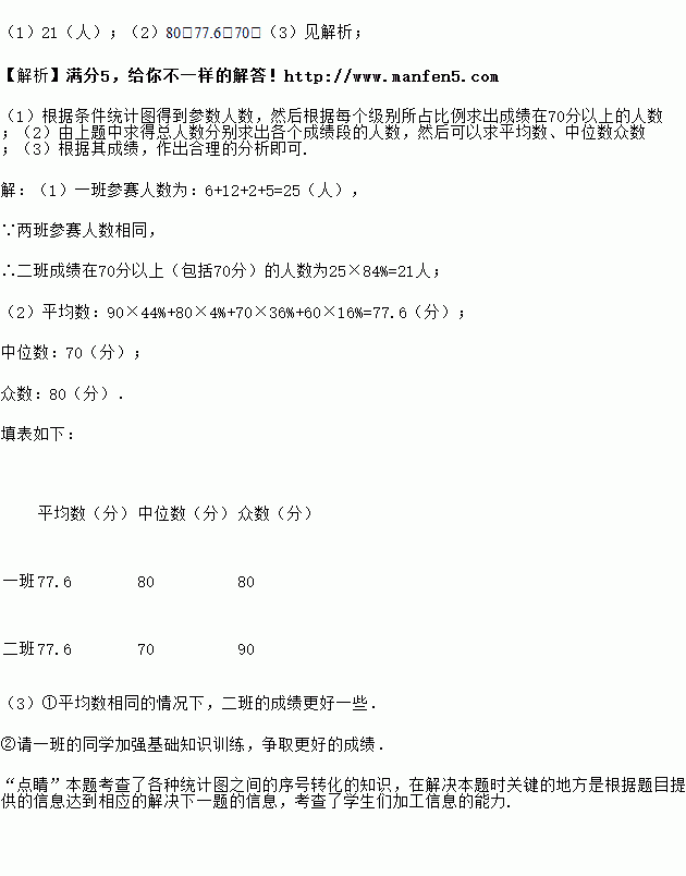 (1)此次竞赛中二班成绩在70分及其以上的人数有 人;