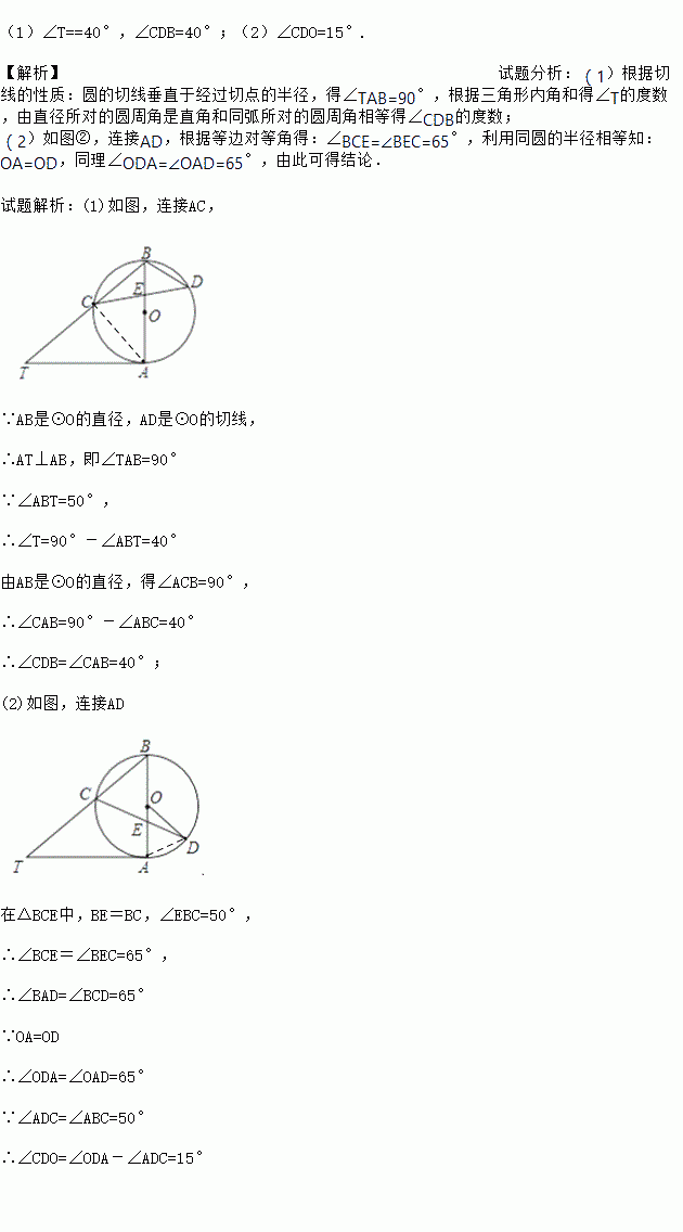 已知AB是⊙O的直径,AT是⊙O的切线,∠ABT=50°,BT交⊙O于点C,E是AB上一点,延长CE交⊙O于点D.