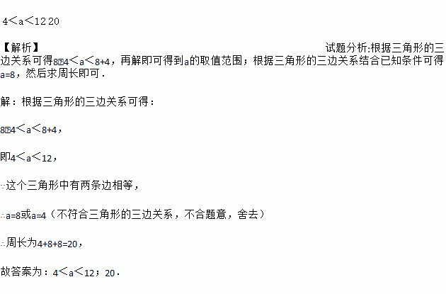 4<a<12 20 【解析】试题分析:根据三角形的三边关系可得8﹣4<a<8+4,再解即可得到a的取值范围;根据三角形的三边关系结合已知条件可得a=8,然后求周长即可. 【解析】 根据三角形的三边关系可得: 8﹣4<a<8+4, 即4<a<12, ∵这个三角形中有两条边相等, ∴a=8或a=4(不符合三角形的三边关系,不合题意,舍去) ∴周长为4+8+8...