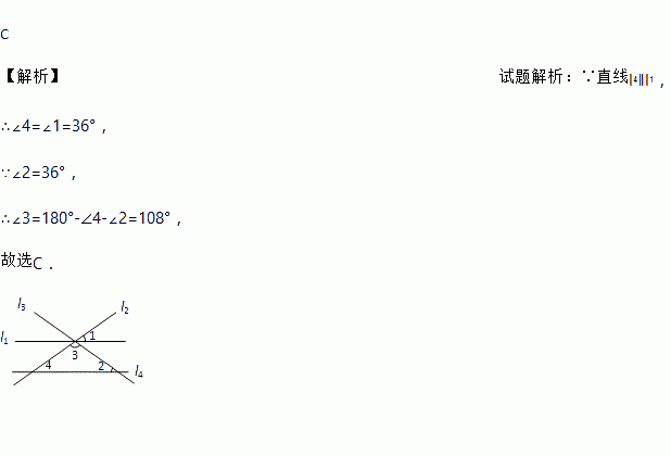 如图,直线l1,l2,l3交于一点,直线l4// l1,若∠1= ∠2=36°,则 ∠3的度数为
