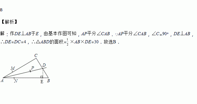 MN的长为半径作圆弧,在∠BAC内,两弧交于点P;③作射线AP交边BC于点D,若CD=4,AB=15,则△ABD的面积是( )
