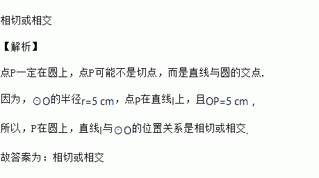 ⊙O的半径r=5 cm,点P在直线l上,若OP=5 cm,则直线l与⊙O的位置关系是__________________。