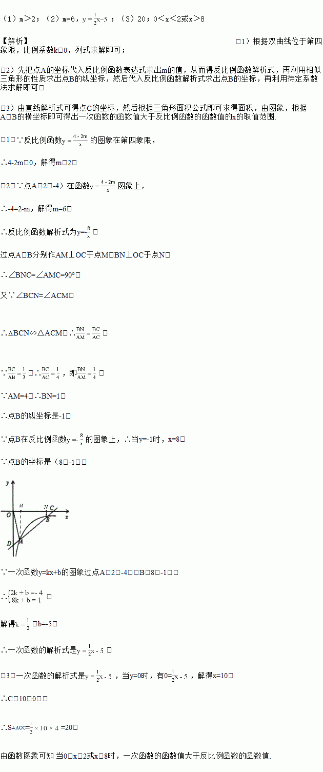 (3)在(2)的条件下,连接OA,求△AOC的面积并直接写出一次函数的函数值大于反比例函数的函数值的x的取值范围.