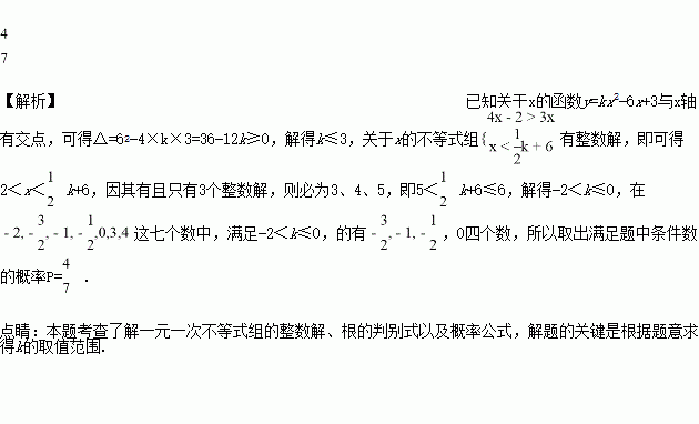 从这七个数中,随机取出一个数,记为,那么使关于的函数与轴有交点,且使关于的不等式组 有且只有3个整数解的概率为___________ .