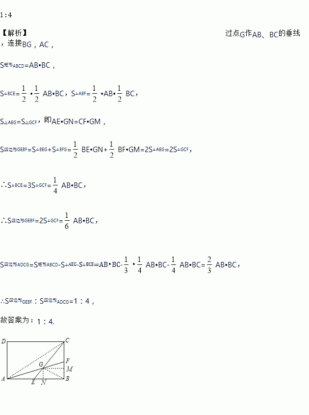 如图,E、F分别是矩形ABCD的边AB、BC的中点,连AF,CE,AF、CE交于G,则四边形BEGF与四边形ADCG的面积的比值为___________.