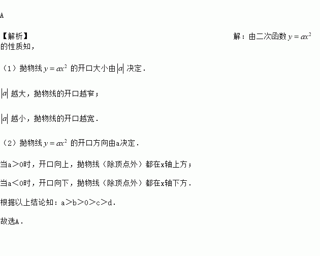 A 【解析】【解析】 由二次函数的性质知, (1)抛物线的开口大小由决定. 越大,抛物线的开口越窄; 越小,抛物线的开口越宽. (2)抛物线的开口方向由a决定. 当a>0时,开口向上,抛物线(除顶点外)都在x轴上方; 当a<0时,开口向下,抛物线(除顶点外)都在x轴下方. 根据以上结论知:a>b>0>c>d. 故选A.