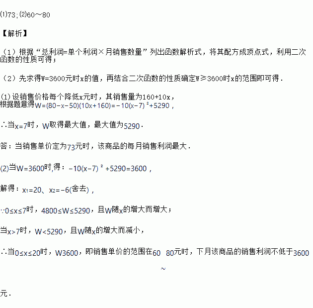 某商户购进某种商品的进价是50元/个,根据市场调研发现售价是80元/个时,每月可卖出160 个,若销售单价每降低1元,则每月可多卖出10 个.设销售价格每个降低x元时,该商品每月的销售利润为W 元.