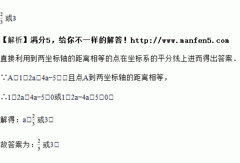 己知A(1+2a,4a﹣5),且点A到两坐标轴的距离相等,则a=_____.