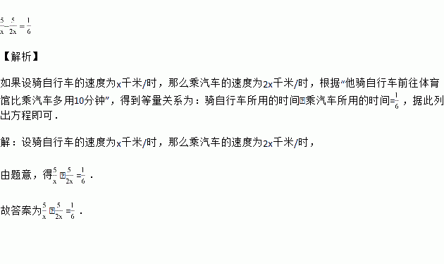 小成每周末要到距离家5千米的体育馆打球,他骑自行车前往体育馆比乘汽车多用10分钟,乘汽车的速度是骑自行车速度的2倍.设骑自行车的速度为x千米/时,根据题意列方程为 .