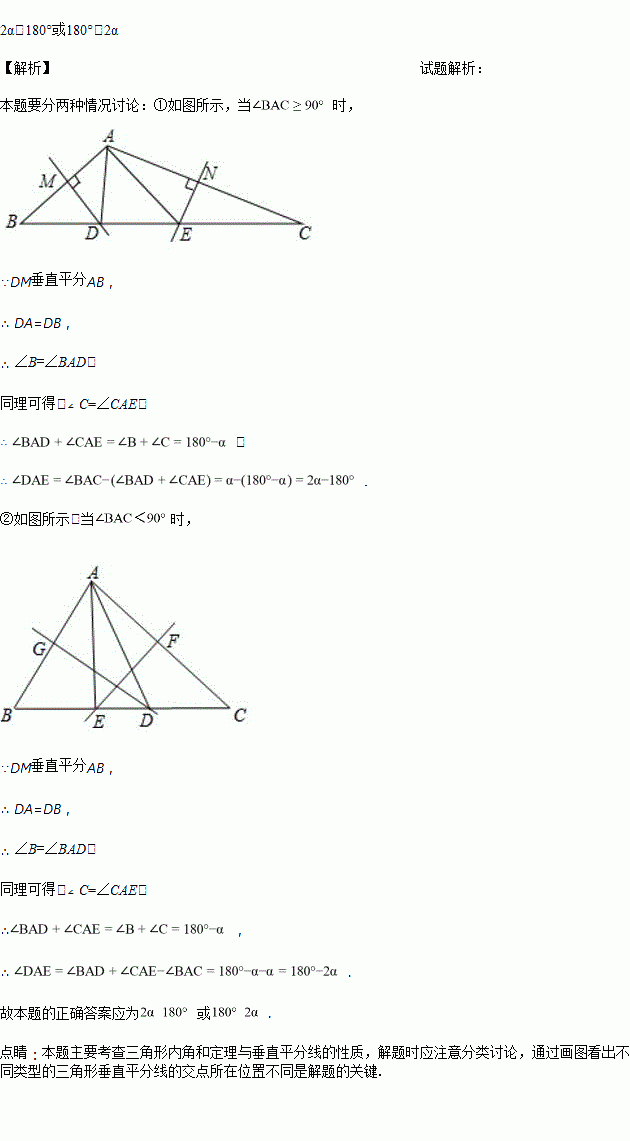 在△ABC中,∠BAC=α,边AB的垂直平分线交边BC于点D,边AC的垂直平分线交边BC于点E,连结AD,AE,则∠DAE的度数为_____.(用含α的代数式表示)