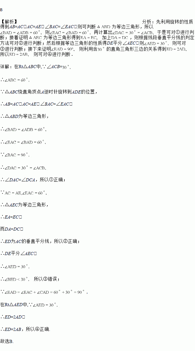 如图,将30°的直角三角尺ABC绕直角顶点A逆时针旋转到ADE的位置,使B点的对应点D落在BC边上,连接EB、EC,则下列结论:①∠DAC=∠DCA;②ED为AC的垂直平分线;③∠BED=30°;④ED=2AB.其中正确的是( )