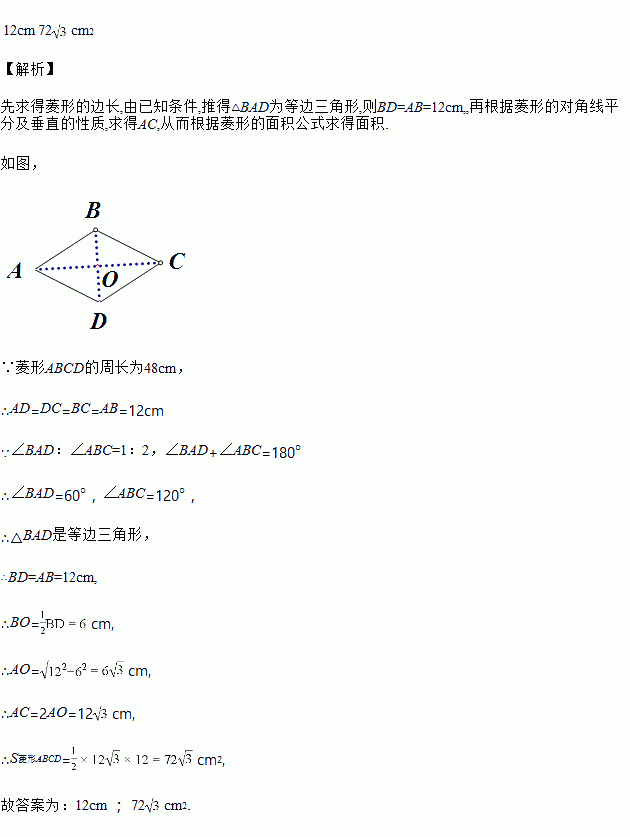 菱形ABCD的周长为48cm,∠BAD:∠ABC=1:2,则BD=_____,菱形的面积是______.