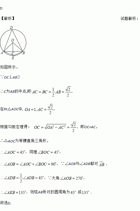 在半径为1的圆中,长度等于的弦所对的圆周角的度数为( )