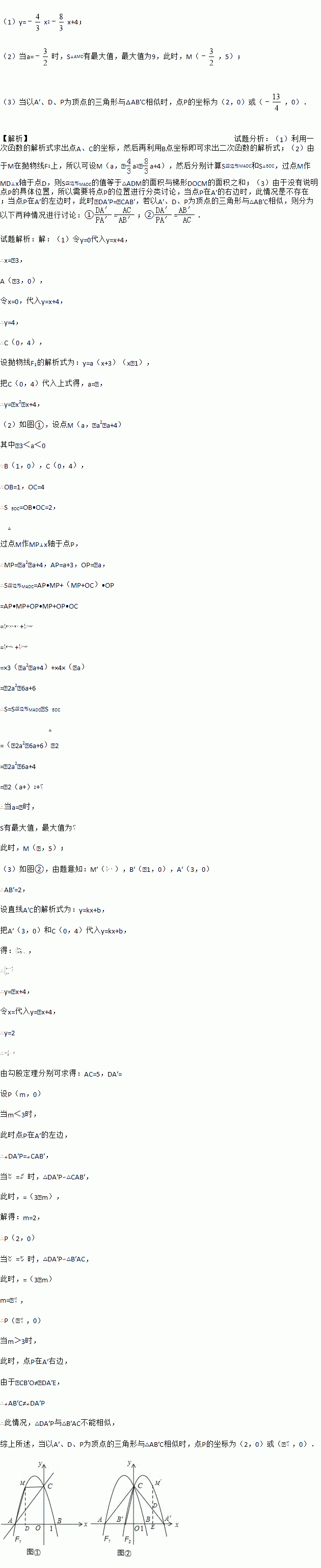 (1)y=﹣x2﹣x+4; (2)当a=﹣时,S△AMC有最大值,最大值为9,此时,M(﹣,5); (3)当以A′、D、P为顶点的三角形与△AB′C相似时,点P的坐标为(2,0)或(﹣,0). 【解析】试题分析:(1)利用一次函数的解析式求出点A、C的坐标,然后再利用B点坐标即可求出二次函数的解析式;(2)由于M在抛物线F1上,所以可设M(a,﹣a2﹣a+4),然后分别计算S四边...