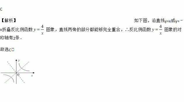 C 【解析】如下图,沿直线y=x或y=﹣x折叠反比例函数图象,直线两旁的部分都能够完全重合,∴反比例函数图象的对称轴有2条. 故选C.