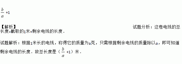 +1 【解析】试题分析:这卷电线的总长度=截取的1米+剩余电线的长度. 试题解析:根据1米长的电线,称得它的质量为a克,只需根据剩余电线的质量除以a,即可知道剩余电线的长度.故总长度是(+1)米.