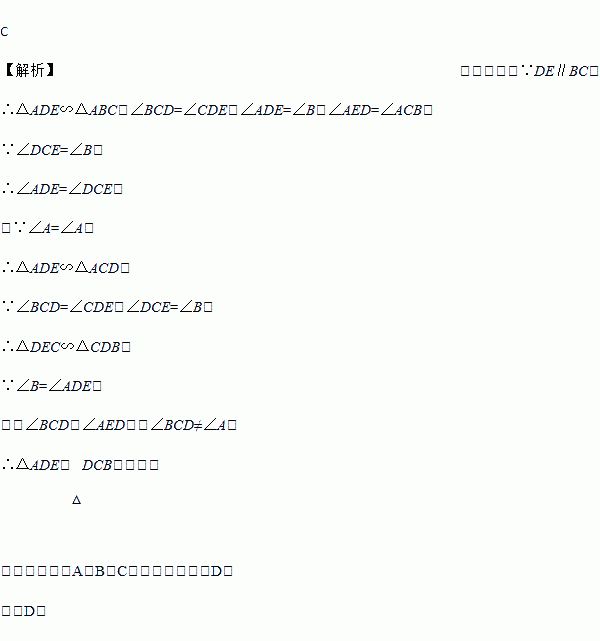 C 【解析】试题解析:∵DE∥BC, ∴△ADE∽△ABC,∠BCD=∠CDE,∠ADE=∠B,∠AED=∠ACB, ∵∠DCE=∠B, ∴∠ADE=∠DCE, 又∵∠A=∠A, ∴△ADE∽△ACD; ∵∠BCD=∠CDE,∠DCE=∠B, ∴△DEC∽△CDB; ∵∠B=∠ADE, 但是∠BCD<∠AED,且∠BCD≠∠A, ∴...