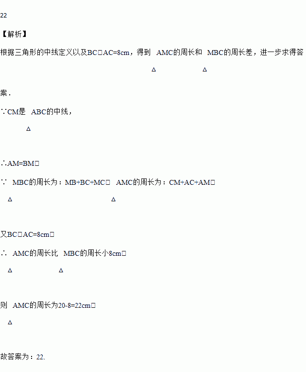 在△ABC中,CM是AB边上的中线,已知BC﹣AC=8cm,且△MBC的周长为30cm,则△AMC的周长为_____cm.