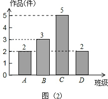 分析 (1)由题意得:所调查的4个班征集到的作品数为:5÷$\frac{150}{360}$=12(件),B作品的件数为:12-2-5-2=3(件);继而可补全条形统计图;