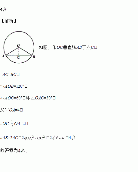 如图所示,⊙O的半径OA=4,∠AOB=120°,则弦AB长为____________.