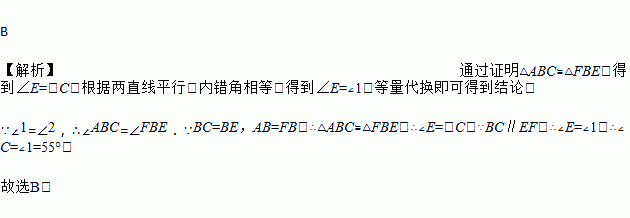 如图,BC∥EF,BC=BE,AB=FB,∠1=∠2,若∠1=55°,则∠C的度数为( )
