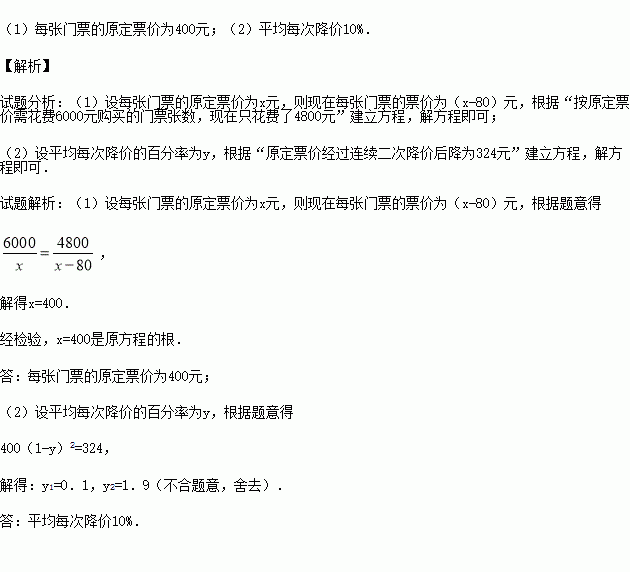 (2)根据实际情况,活动组织单位决定对于个人购票也采取优惠政策,原定票价经过连续二次降价后降为324元,求平均每次降价的百分率.