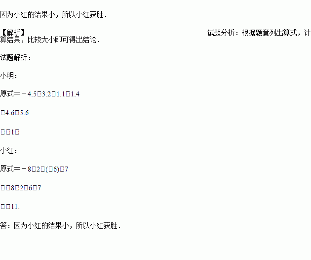 小红和小明根据下图做游戏,在游戏中规定:长方形表示加,圆形表示减,结果小的获胜.列式计算,小明和小红谁为胜者?