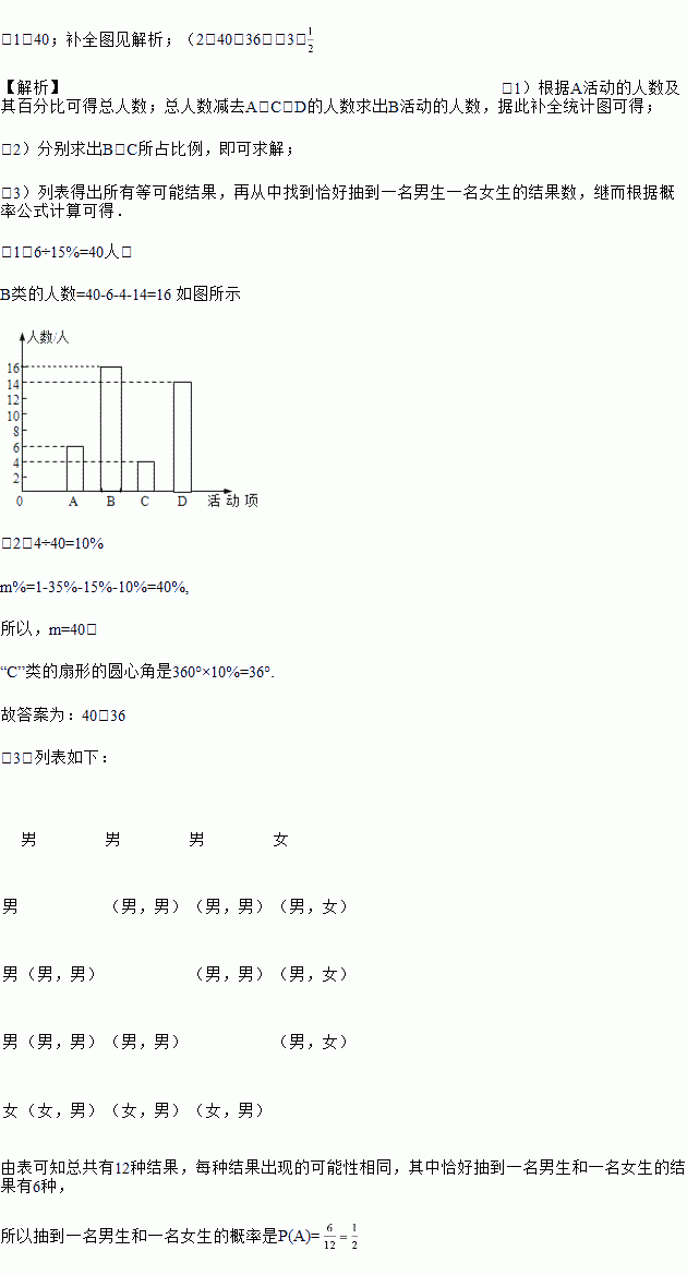 (3)已知在被调查的最喜欢“党史知识竞赛”项目的4个学生中只有1名女生,现从这4名学生中任意抽取2名学生参加该项目比赛,请用画树状图或列表的方法,求出恰好抽到一名男生一名女生的概率.