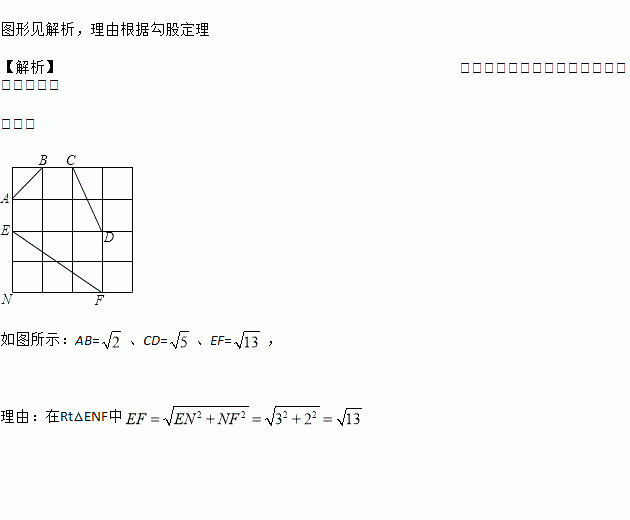 如图,正方形网格中的每个小正方形边长都是1,任意连结这些小正方形的顶点,可得到一些线段。请在图中画出这样的线段,并选择其中的一个说明这样画的道理.